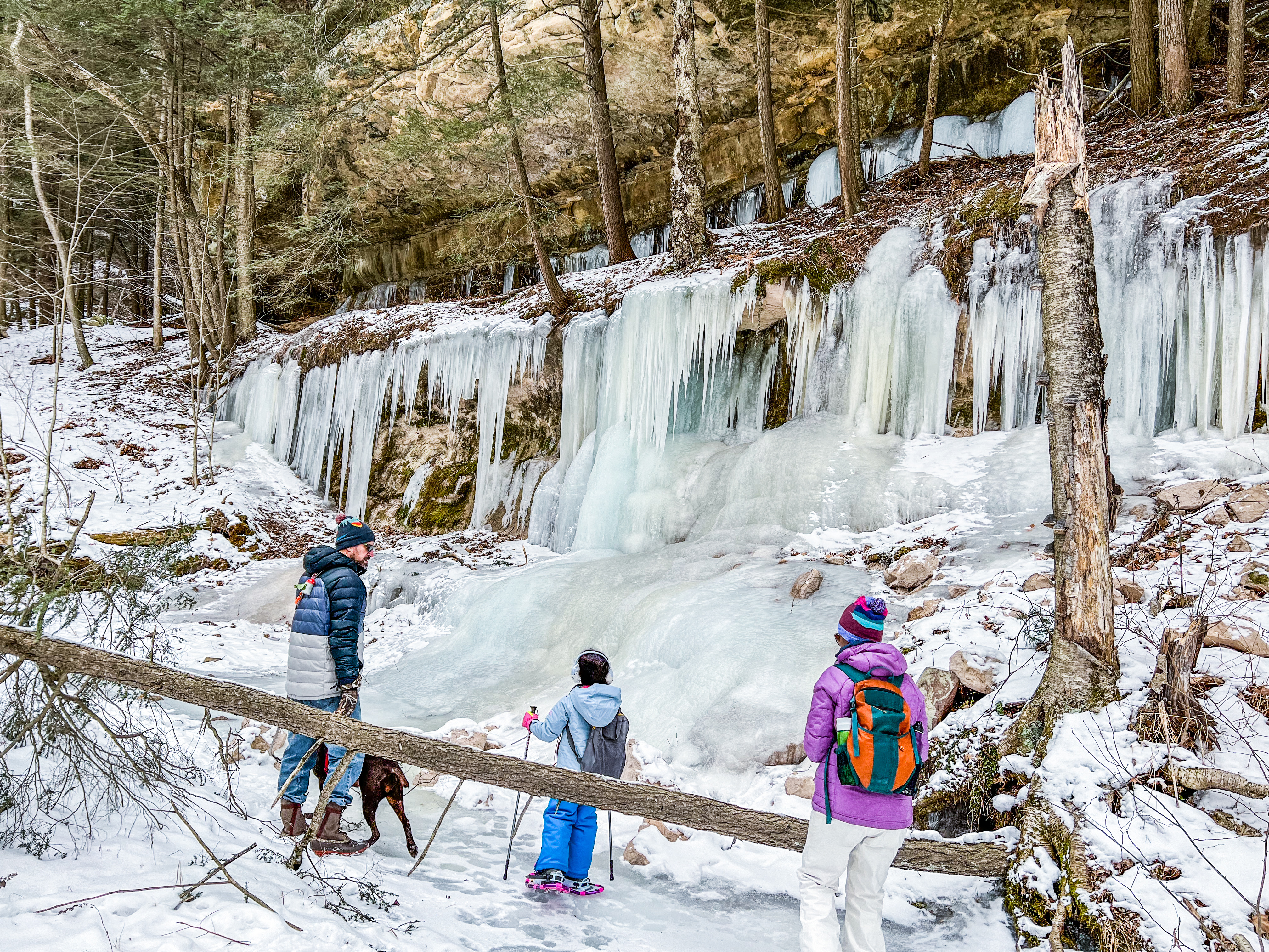 - Pine Hollow State Natural Area: Pine Hollow State Natural Area is a beautiful location with not-so-great parking or access, especially in the winter. If you’re in shape and willing to go off-trail, you should check it out. To get here, turn to Pine Hollow Rd. Once you are on the gravel, try to park on the side road. No signs and trailheads tell you if you’ve gone too far. The DNR advises you to park on the shoulder and “hike in. In the winter, when the snow is deep. When I did it in February 2021, I Parked on Pine Hollow Road. People can’t find this hidden area because there is no actual trail, the road is not plowed, not even a parking lot, and it’s not easy to turn around. This hike is for people comfortable in snowshoes to find the 15 ft tall ice wall; it is very adventurous, so be prepared. Reaching the ice wall from Pine Hollow is rapid, and you can quickly hike down to the ice. Keep in mind that you’ll have to hike back up. Getting back out of the hollow is challenging. Physically bring your hiking poles and wear cleats for this hike. My daughter was seven and loved this area.